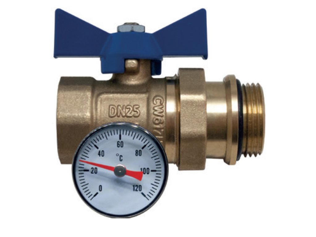 Kulový kohout mosazný 1" přímý s těsněním a teploměrem - modrý