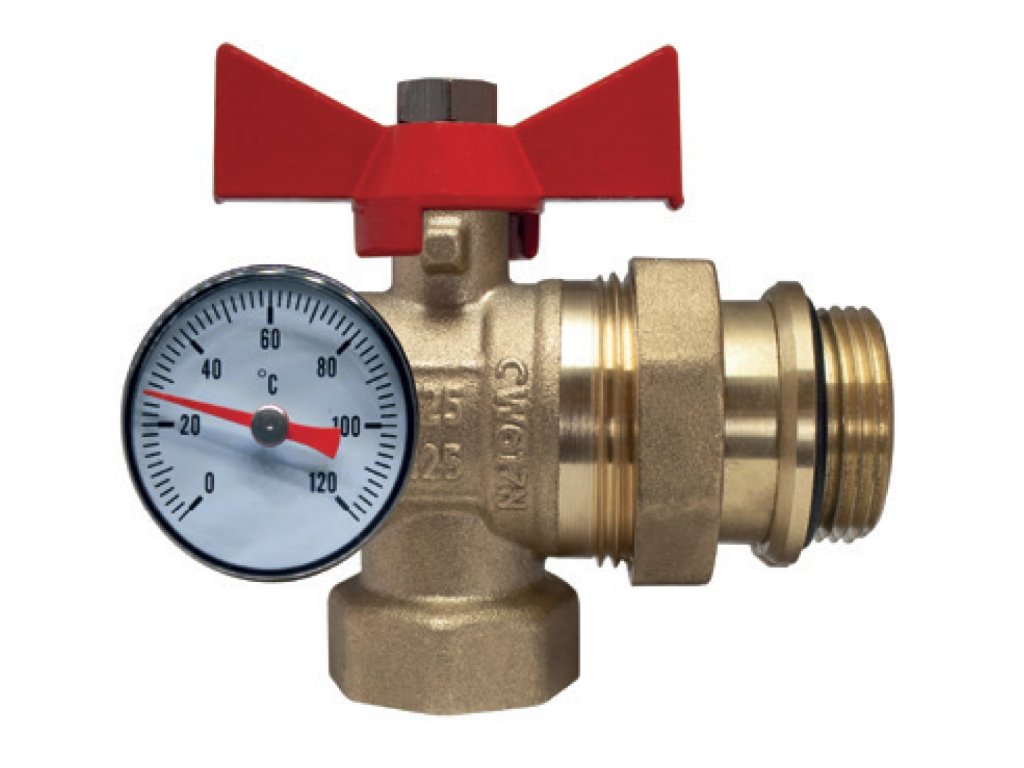 Kulový kohout mosazný 1" rohový s těsněním a teploměrem - červený