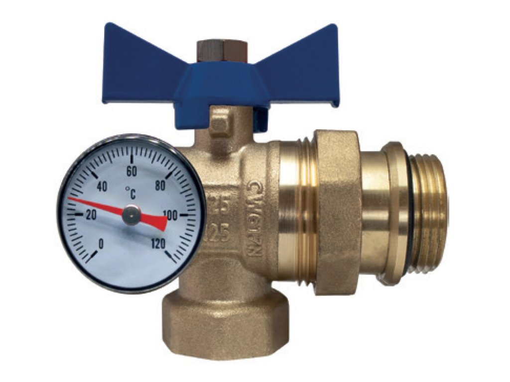 Kulový kohout mosazný 1" rohový s těsněním a teploměrem - modrý