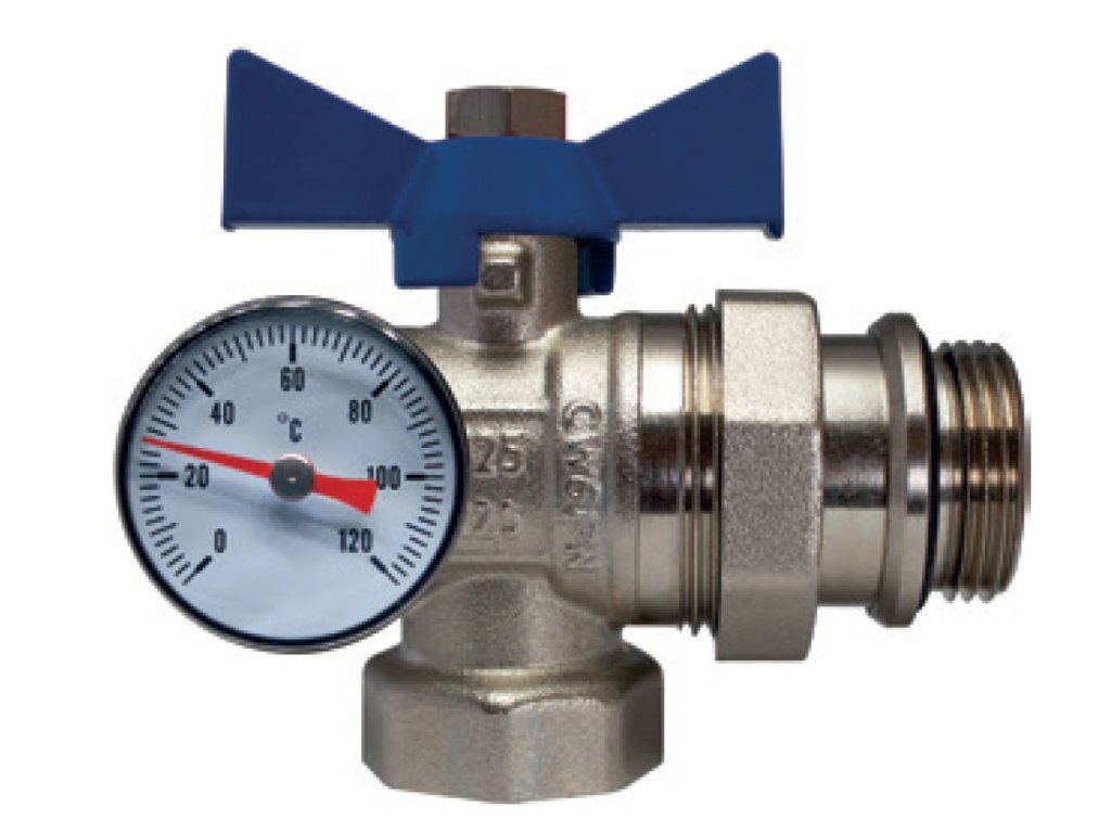 Kulový kohout niklovaný 1" rohový s těsněním a teploměrem - modrý