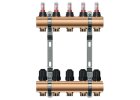 Mosazný rozdělovač podlahového topení s hlavicemi a průtokoměry